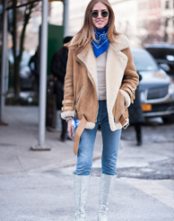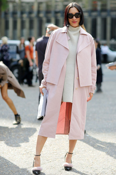 Instagram時(shí)尚伙伴關(guān)系負(fù)責(zé)人Eva Chen用簡約的粉色大衣搭配白色長款高領(lǐng)針織裙,輕松制造出層次感,絨毛裝飾的尖頭高跟鞋更具玩味。